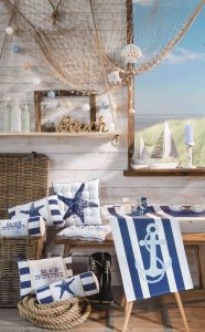 Poszewki na poduszki w odcieniu morskiej bryzy i granatu stworzą odpowiednią aurę w salonie i sypialni. Jeśli zestawicie je z narzutą na sofę lub łóżko w którymś z tych kolorów albo w beżowym lub szarym odcieniu, to jeszcze wzmocnicie klimat. Niemniej ważne są dekoracje – jeśli macie doniczkowe palmy czy rośliny „palmopodobne” wyeksponujcie je. Do tego możecie dodać parę akcentów typu gotowe figurki albo własnoręcznie zrobione dekoracje.